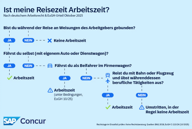 Nach deutscher Rechtsprechung (BAG) gilt die An‑ und Abreise zum Geschäftsreiseziel grundsätzlich als Arbeitszeit, wenn sie im Auftrag des Arbeitgebers erfolgt.