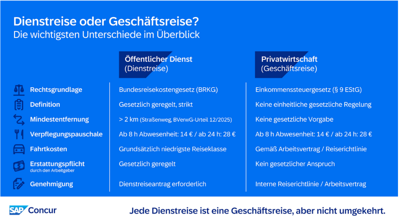 Eine Geschäftsreise liegt vor, wenn eine dienstlich veranlasste Tätigkeit außerhalb der ersten Tätigkeitsstätte und der Wohnung erfolgt, auf Anordnung des Arbeitgebers stattfindet, länger als acht Stunden dauert und nicht länger als drei Monate am selben Ort ausgeübt wird, weiss SAP Concur und erklärt auch, warum das so ist. Das neue Urteil des Bundesverwaltungsgerichts legt für den öffentlichen Dienst fest, dass Tagegeld nur bei mehr als zwei Kilometern Straßenentfernung zwischen Dienststätte und Einsatzort versagt werden darf, was für die Ausgestaltung von Reiserichtlinien und die Reisekostenpraxis relevante Klarheit bringt.